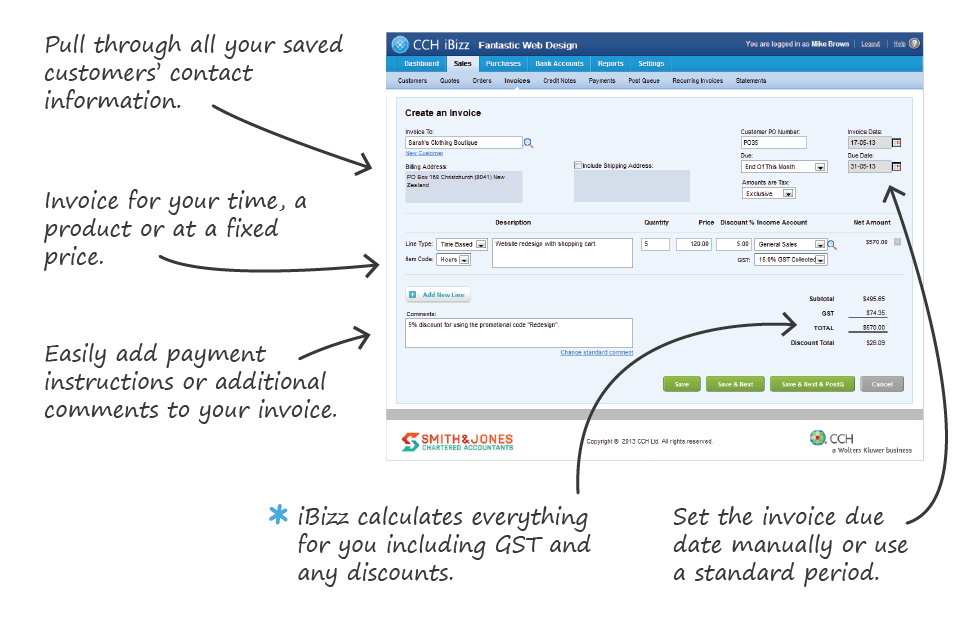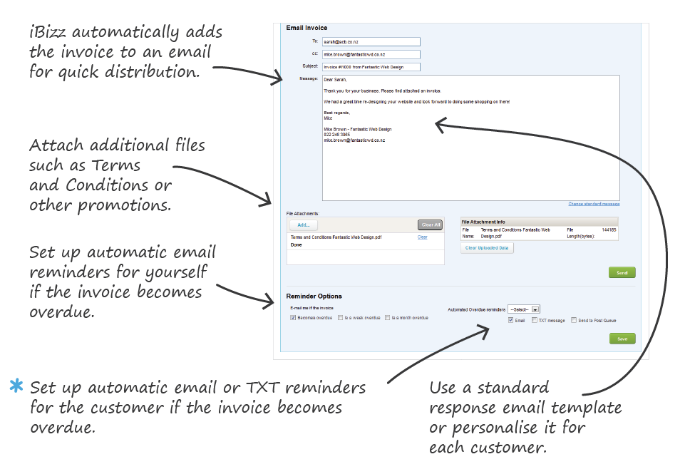 Conveniently send quotes and invoicesCCH iBizz automatically adds your invoice to an email or it can be saved as a PDF for a later date. There are a range of reminder options for both you and your customers to ensure you get paid. |