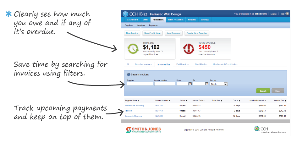 Manage your upcoming paymentsCCH iBizz lets you keep on top of your accounts payable and confidently plan your cashflow for the months ahead. |