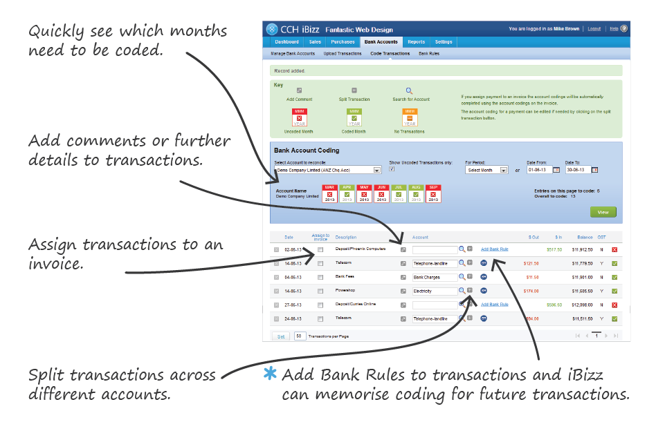 Quickly code bank transactionsCCH iBizz lets you quickly code your bank transactions. Bank feeds update everyday so you are always looking at the most up-to-date information. Using keyword memorisation, CCH iBizz will even code your regular transactions for you saving even more time. |